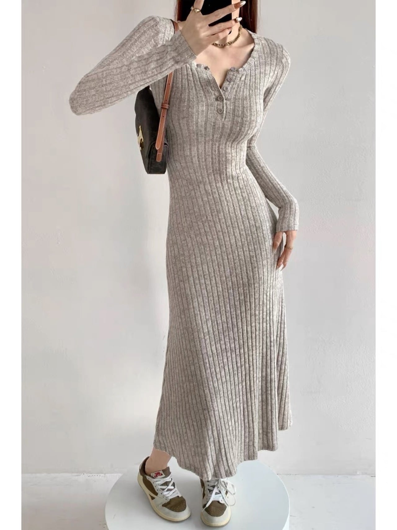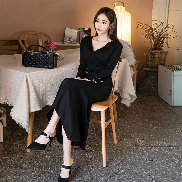 ワンピース ドレス 長袖 S-LL Vネック マーメイドスカート