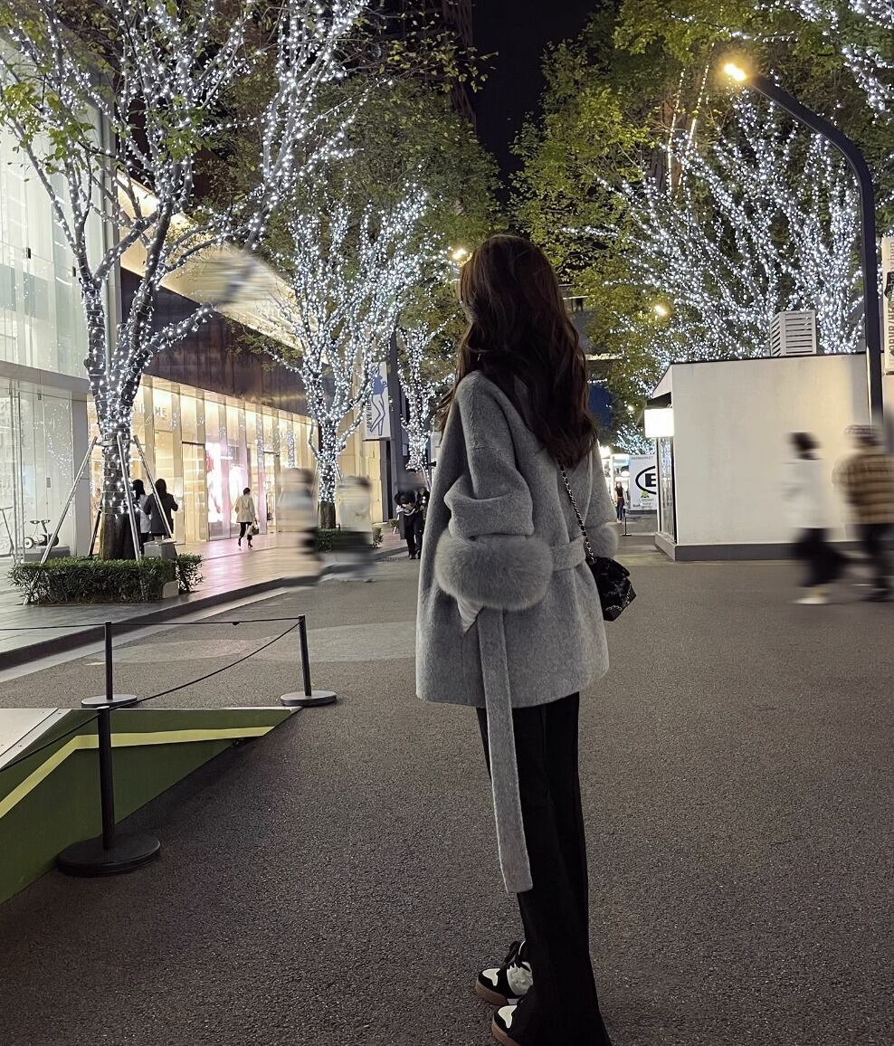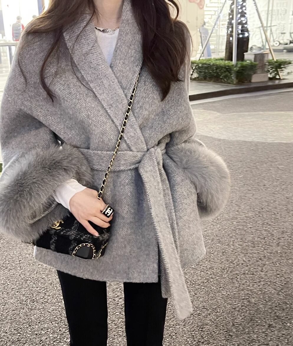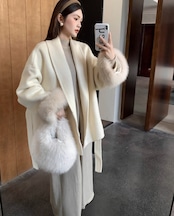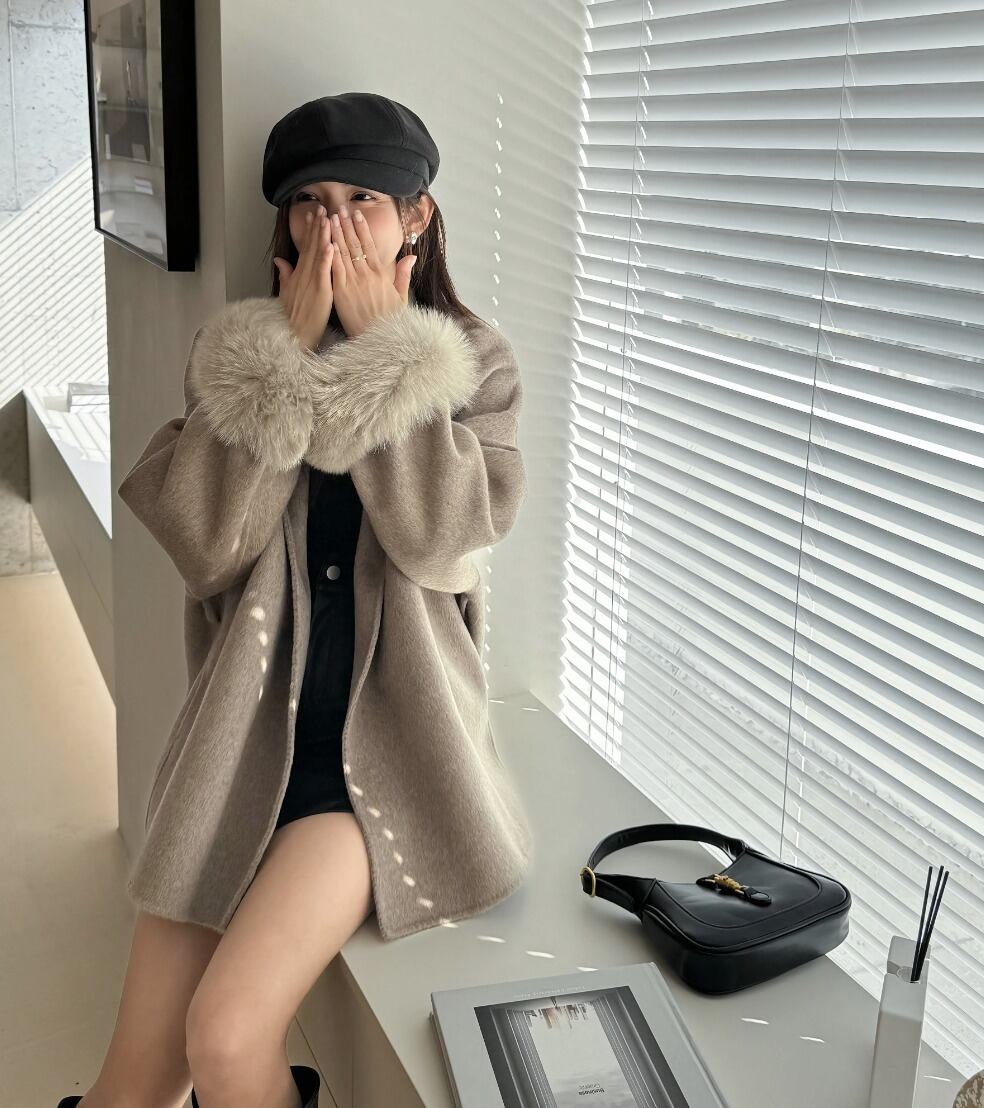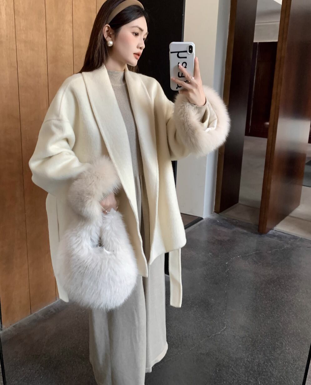フォックスファー ウールコート ウエスト ベルト