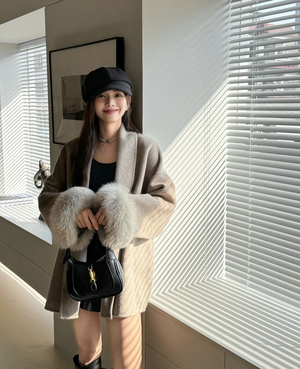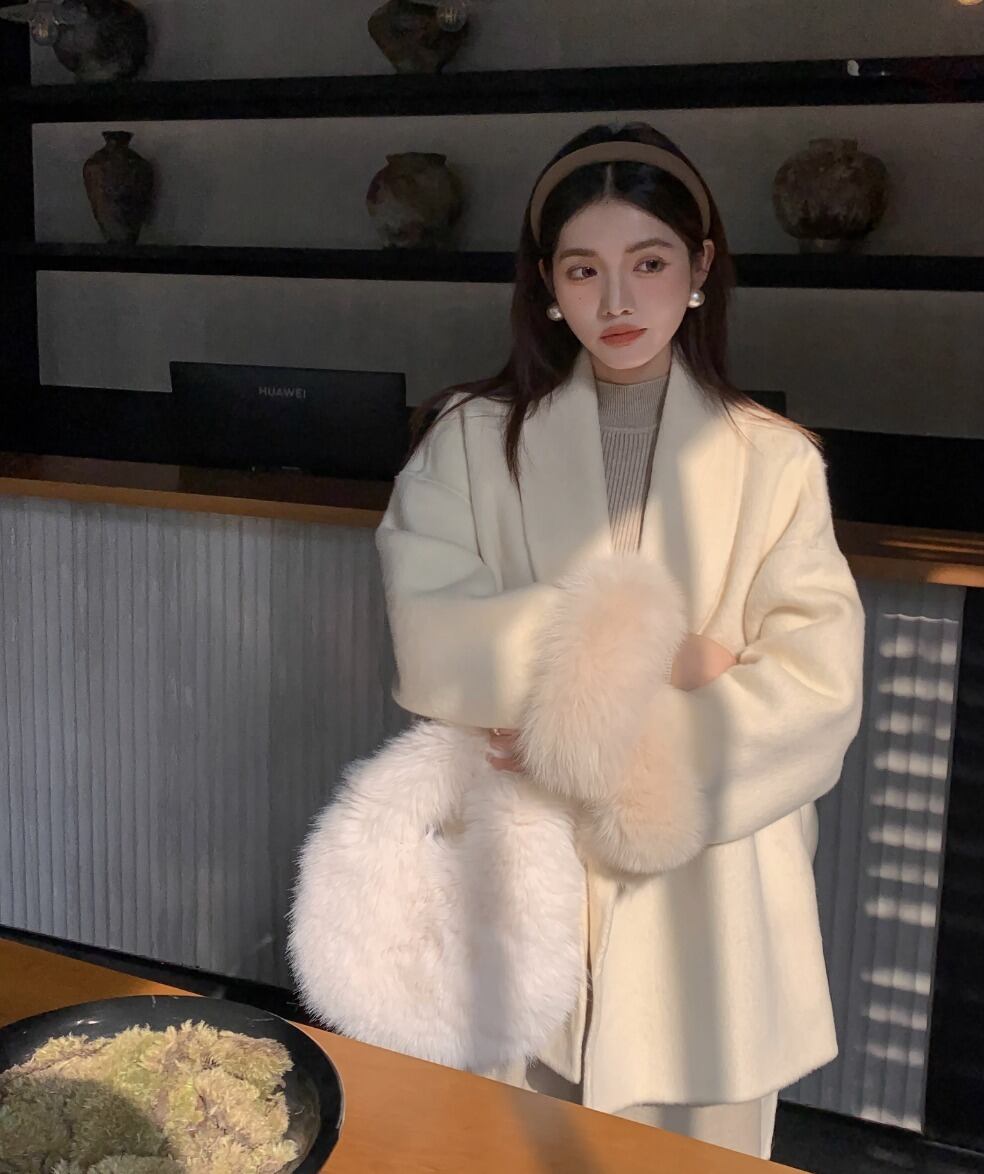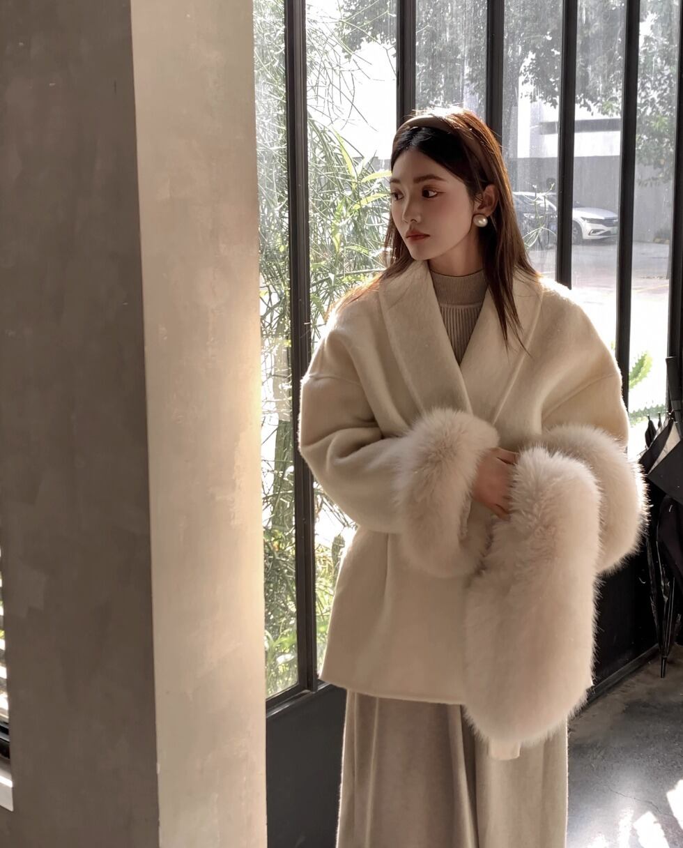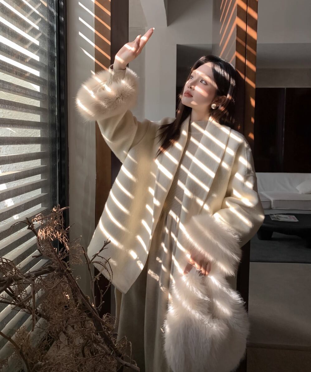フォックスファー ウールコート ウエスト ベルト