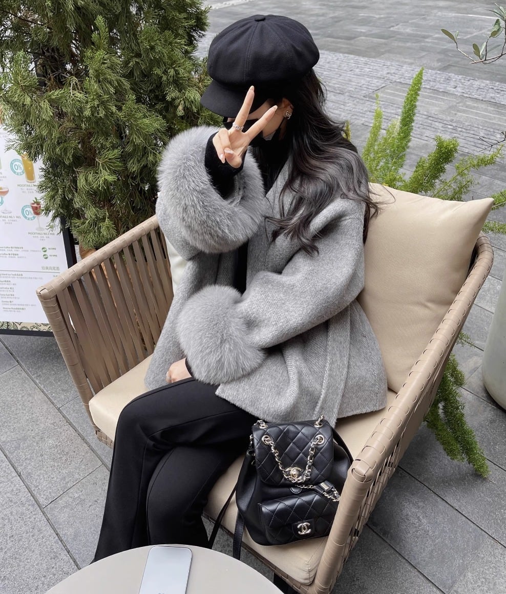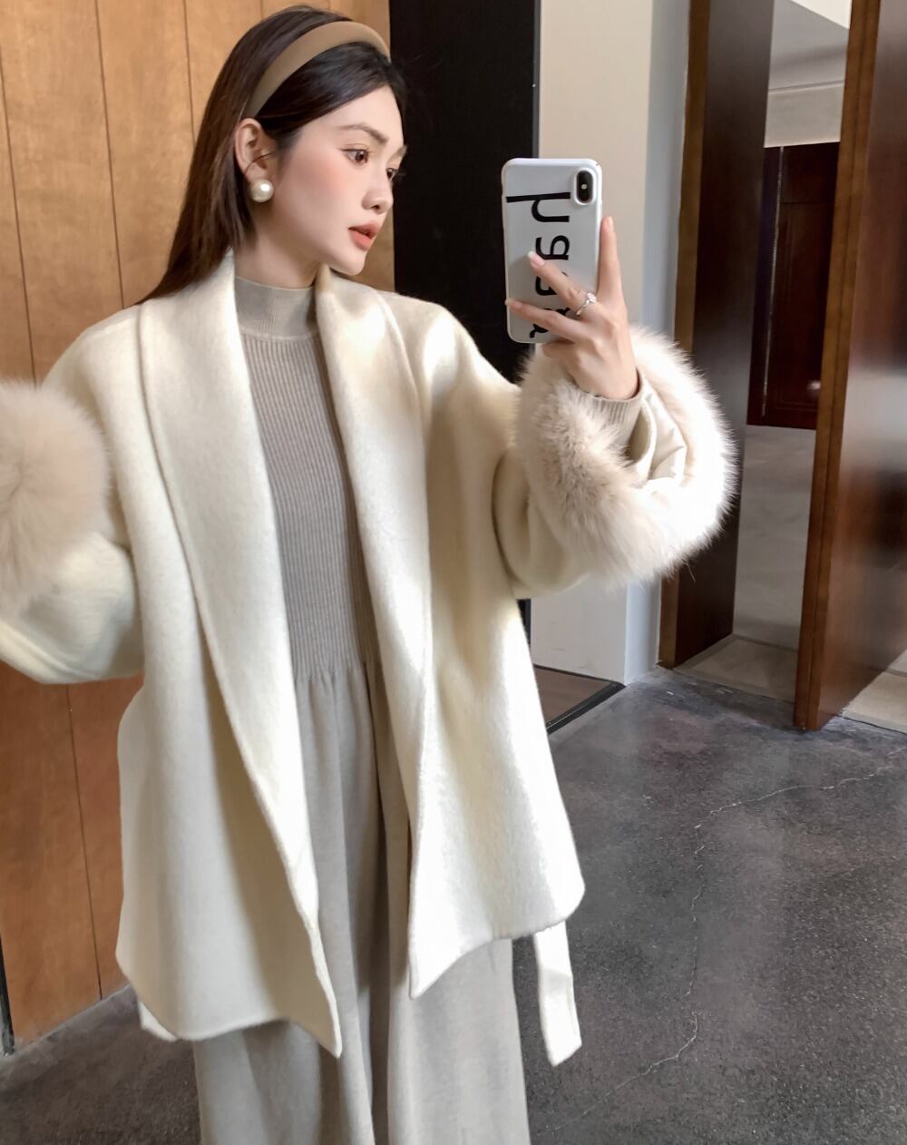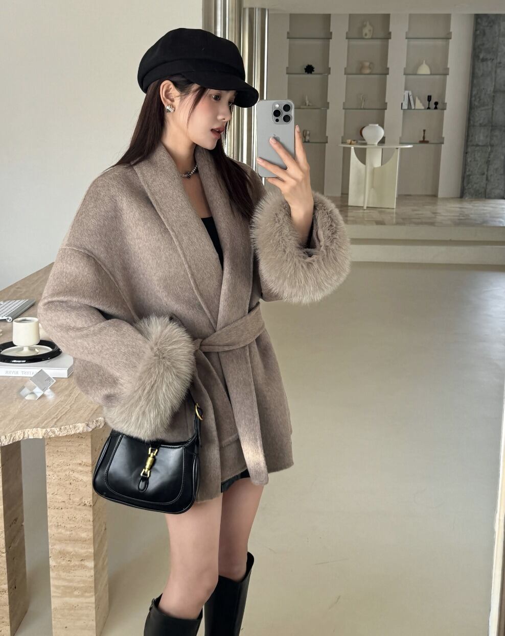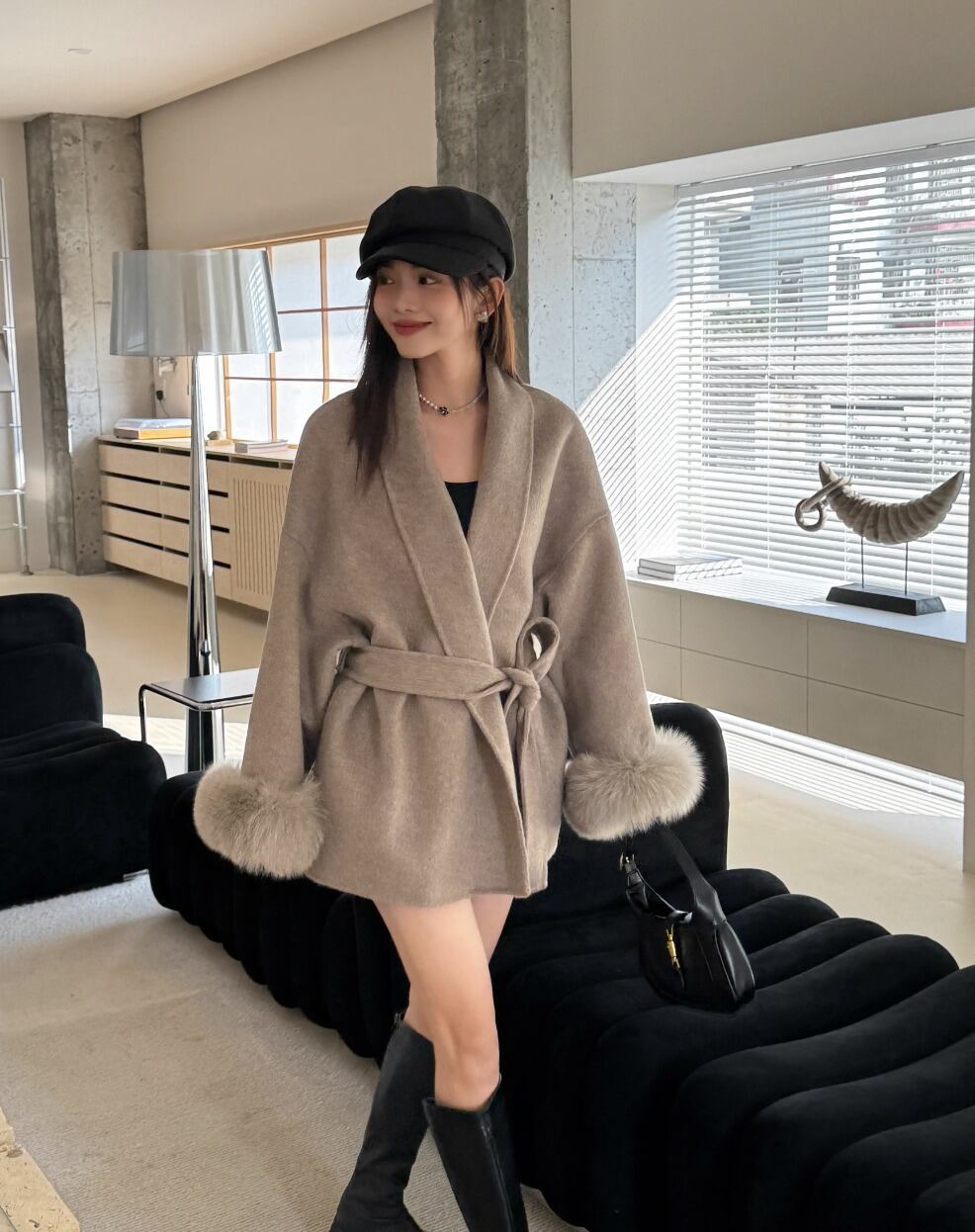 フォックスファー ウールコート ウエスト ベルト