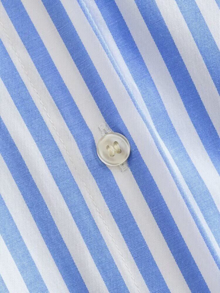 この長袖シャツは、XSからLサイズまで対応しており、どんな体型の方にもフィットします。ストライプデザインが洗練された印象を与え、きれいめスタイルにもぴったり。普段使いからちょっとしたお出かけまで、様々なシーンで活躍します。カジュアルにもフォーマルにも合わせやすい一枚です!