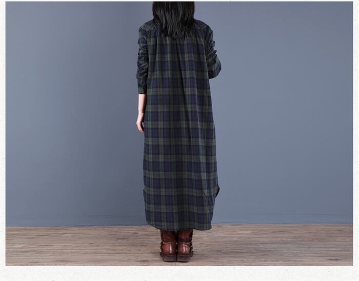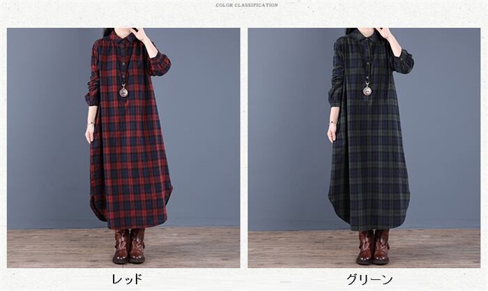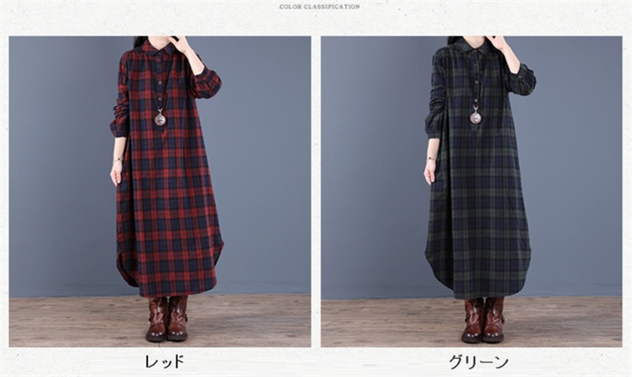 シャツワンピース 長袖 チェック柄 2色 M-2XL ロング丈